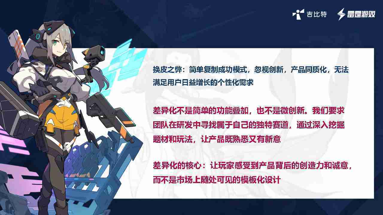 在我们内部是这么定义差异化的。。。。首先,,差异化不是简单的功能叠加,,,,更不是换皮。。只是换皮,,产品无法提供有效的市场价值。。。。内部经常说差异化的产品不是为了迎合市场,,,而是找到一个自己独特的表达方式,,,在研发中找到属于自己的细分赛道和独特赛道,,,,前提是需要对这个题材有足够的深入、、、挖掘,,,,对玩法有足够深入的理解,,,,让产品看起来既熟悉又有新意。。