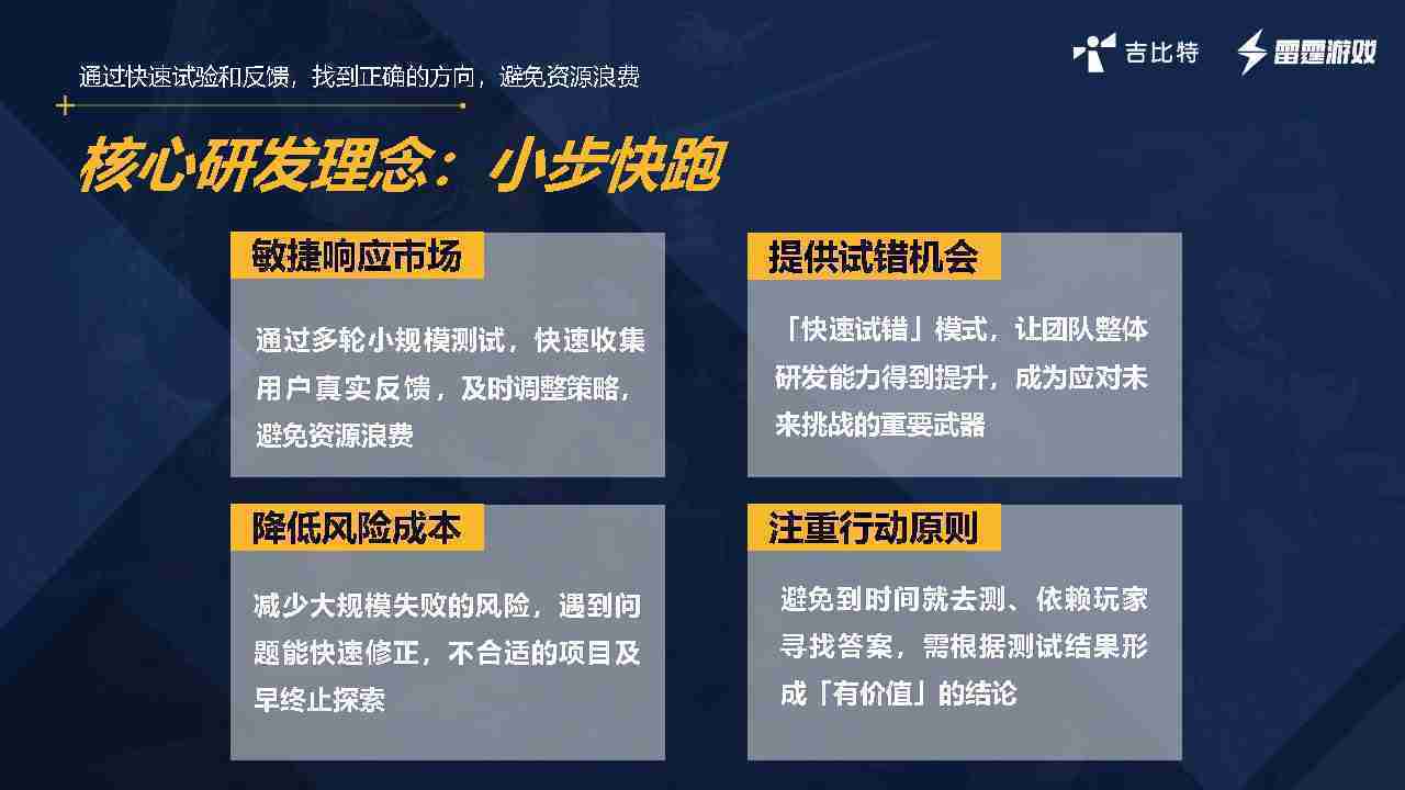 小步快跑不是找答案,,,而是验证答案。。我们之前有项目是这样的,,有些制作人会有几个方向觉得都可以做,,但是不确定做哪一个,,,会选择几个都做,,,做完拿到市场跑,,跑出哪一个更好,,,基于这个再做后续的研发和拓展。。但这种情况最容易出现一个问题,,,,可能被玩家裹胁,,,,玩家说这个点不错、、、、那个点不错,,到底听还是不听,,,不听感觉是无视玩家的反馈,,听的话,,可能自己没想清楚导致研发思路发生偏颇。。。所以针对这一点后面自己复盘整理,,,发现制作人自己心里要有数,,,要做自己觉得好玩的,,而且明确知道这个东西是你想做的,,然后拿到市场验证这个答案是不是对的,,而不是拿一堆答案找哪一个答案更好。。