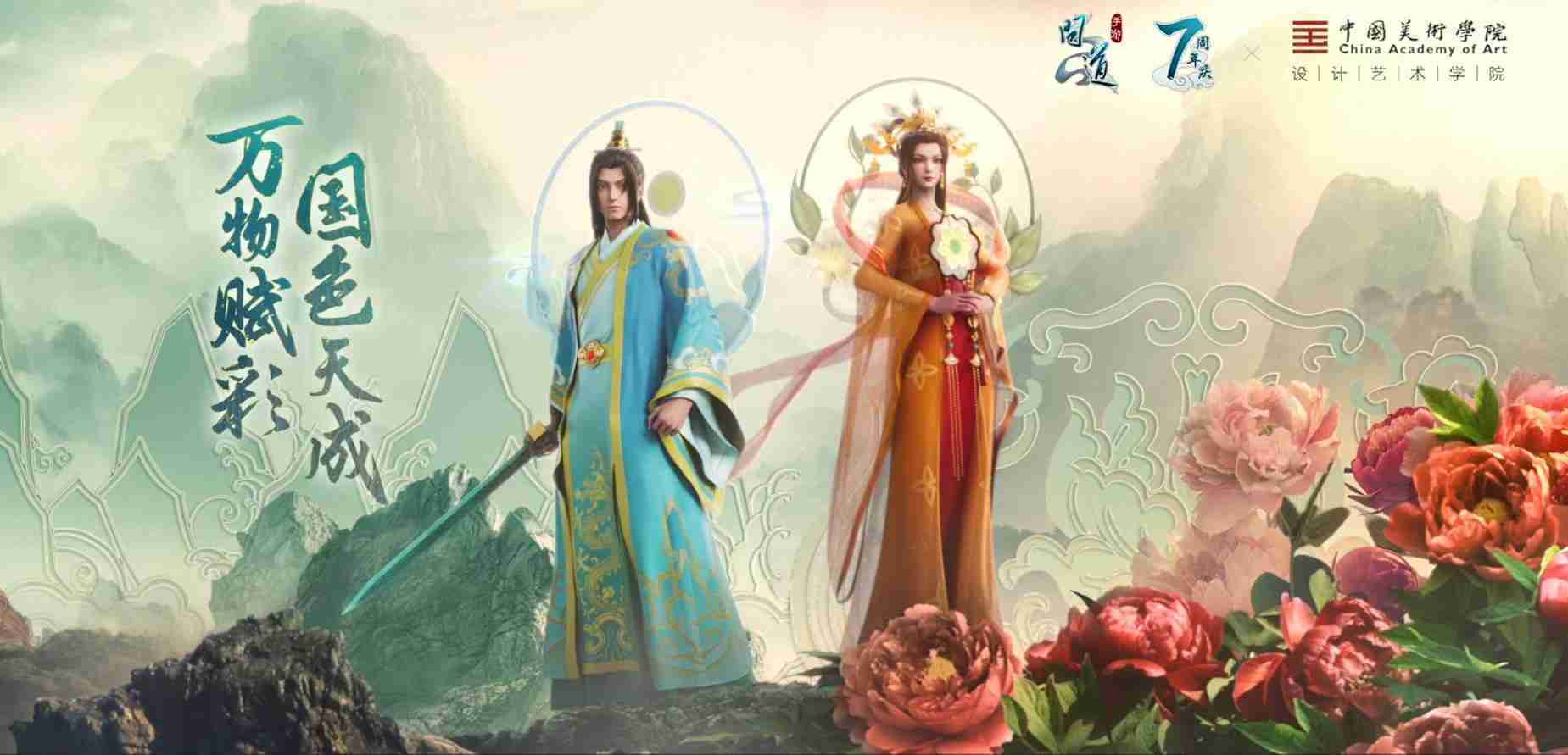 2023年4月,,,,《问道手游》联动中国美术学院,,,,在游戏中融合了中国历史上不同时期的文化元素,,,打造了“山河万象”与“凤鸣九霄”的国风时装。。。在色彩配置方面,,创作团队基于对游戏角色特性的分析提取相应的文化内涵,,从每一种色彩的色相、、指代事物和情感出发对应角色属性,,,,选定服装的色彩搭配。。。。在纹样设计方面,,,,创作团队结合游戏角色自身特殊的造型比例和形态,,,在实际的纹样设计中进行了游戏语境下的活化演绎。。男性角色集中使用了如蟒纹、、、、海水江崖纹、、、如意纹和云气纹等传统纹样元素,,,女性角色则吸纳了凤凰纹、、、、牡丹纹、、卷草缠枝纹等元素,,,,组成以“双凤牡丹纹样”“缠枝牡丹纹”“金玉凤冠头饰”为主要纹样的游戏角色装饰图案系统。。。。