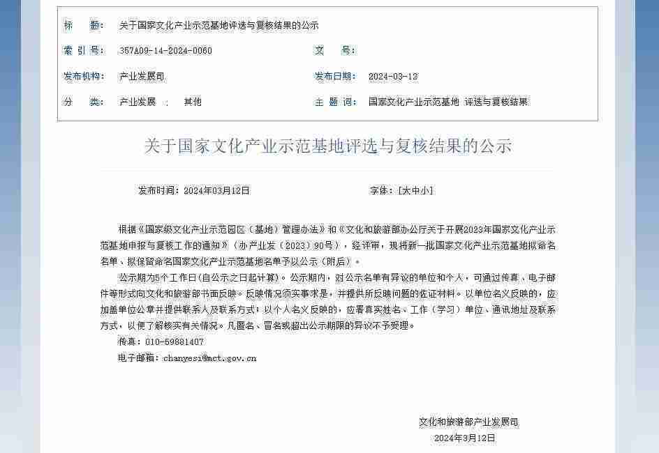 新一批国家文化产业示范基地公示,,,,918.com成功入围