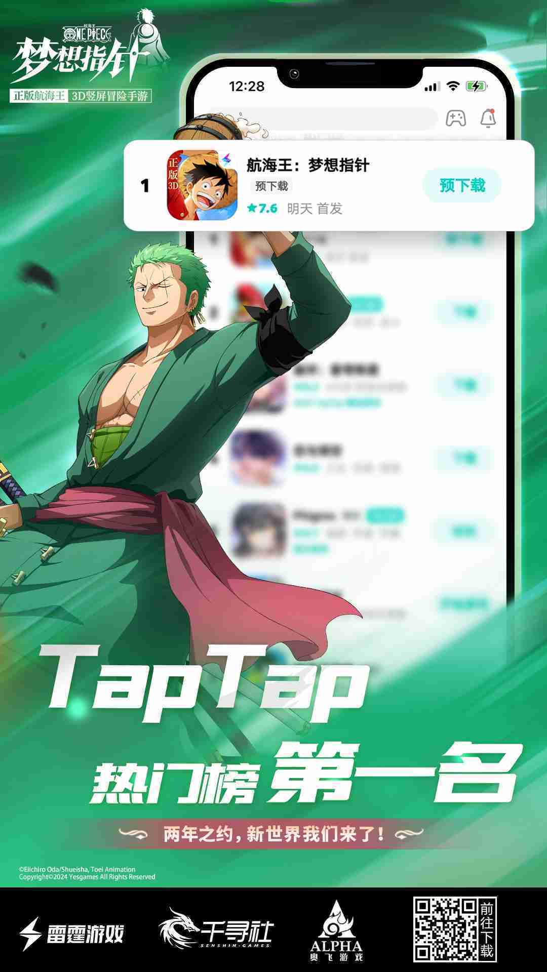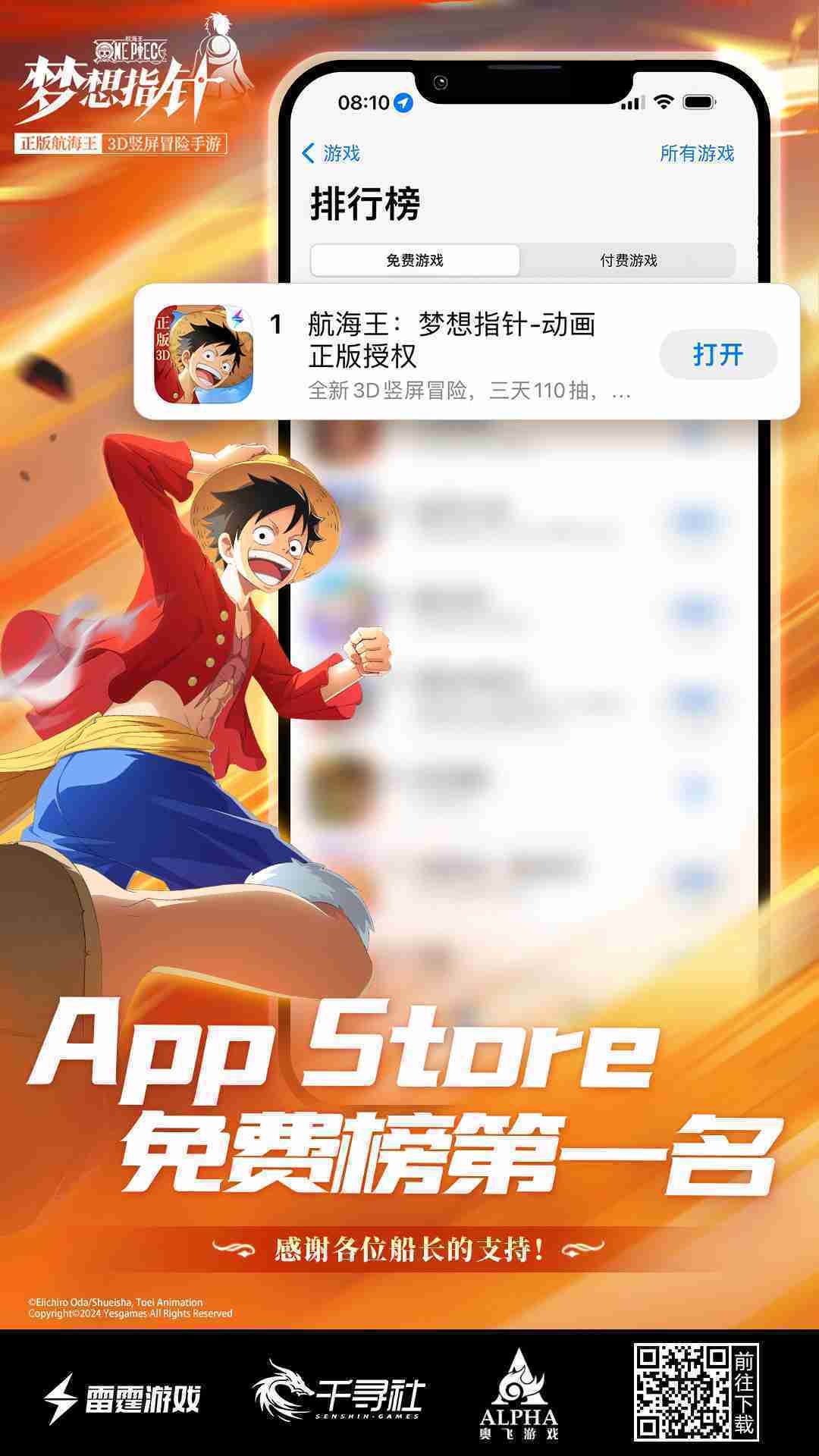 4月1日,,,手游《航海王::梦想指针》正式公测,,上线仅2小时不到就登上了App Store免费榜Top1,,与TapTap热门榜第一。。。。