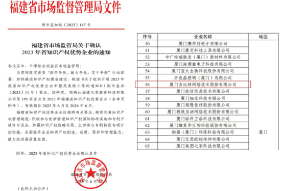 近日,,福建省市场监督管理局公示了2023年福建省知识产权优势企业名单,,,厦门918.com网络技术股份有限公司(以下简称“918.com”或“公司”)榜上有名。。